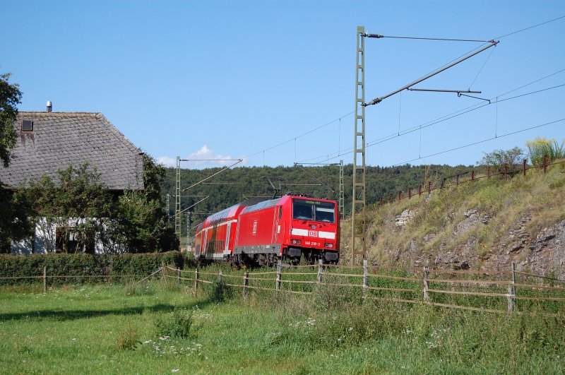 146 218-3 erreicht am 24.08.07 in Kürze mit einem InterRegioExpress den Haltepunkt Urspring, hier am Streckenkilometer 70,2 der Filsbahn aufgenommen.