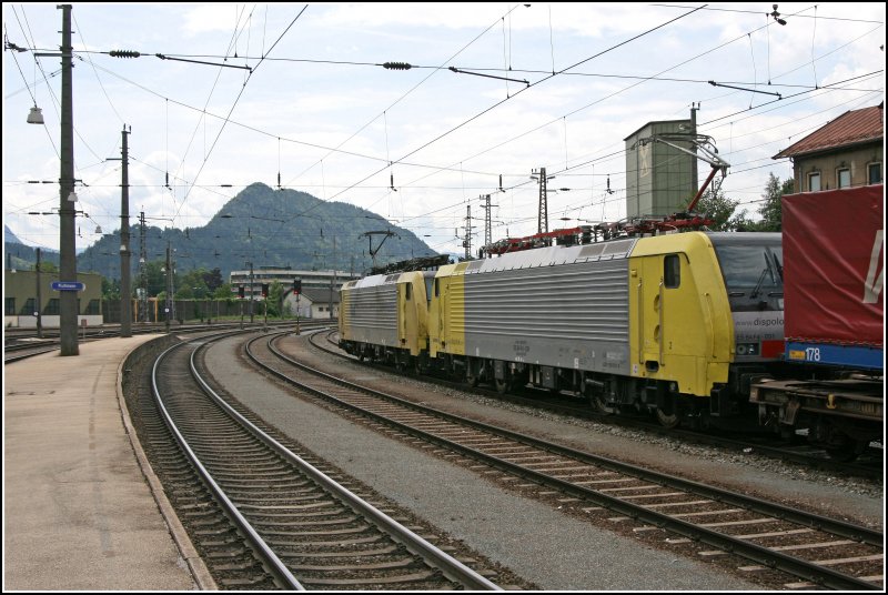Die damals für Test- und Vorführfahrten genutzte E189 901RT und E189 931RT warten am 30.06.07 mit dem DGS 43243 "WINNER-EXPRESS" auf die Beigabe der ES64U2-041 um dann gemeinsam die Rampe des Brenners in Angriff nehmen zu können.