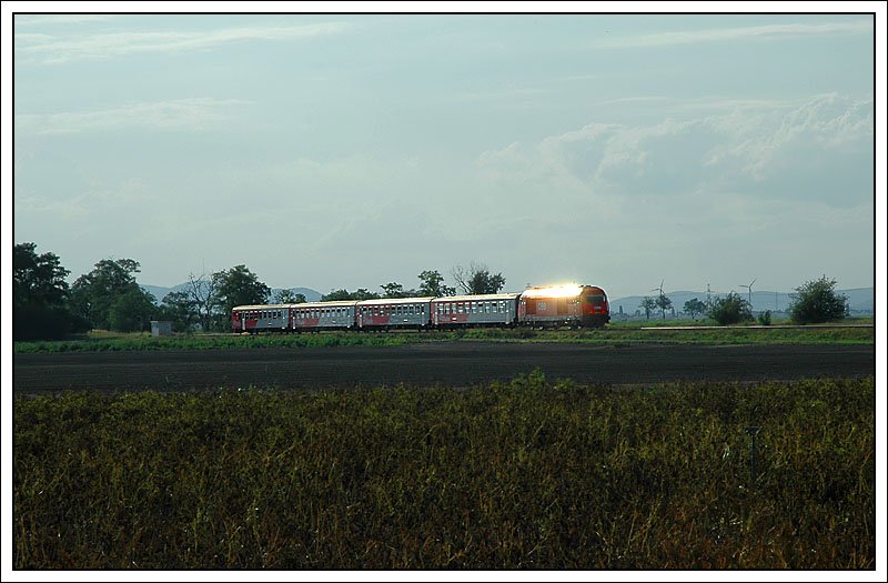 Nachschuss auf den REX 2535 von Bratislava nach Wien, mit einer netten Sonnenspiegelung am Dach der 2016, aufgenommen am 25.8.2007 zwischen Glinzendorf und Raasdorf im Marchfeld.