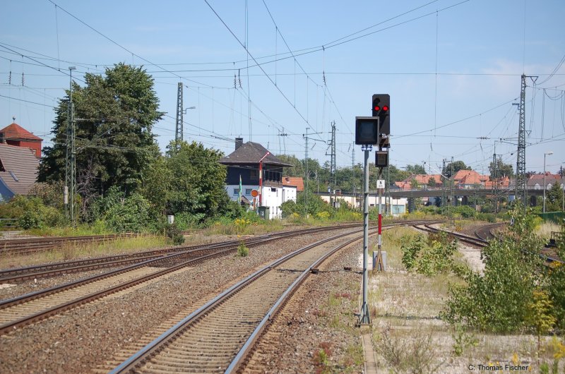 Ausfahrt Richtung Kronach/Coburg. Im Hintergrund das ehemalige Stellwerk 5 des Bhf Lichtenfels das jetzt als Vereinsheim der Eisenbahnfreunde Lichtenfels dient. 06.08.2007