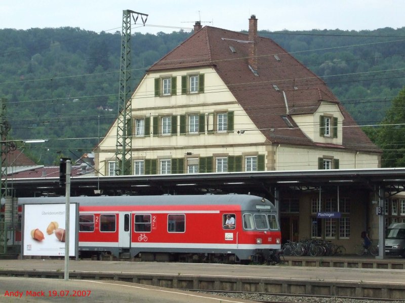 Das Bahnhofsgebäude von Plochingen mit einem gerade abfahrenden Regionalexpress (19.07.2007)