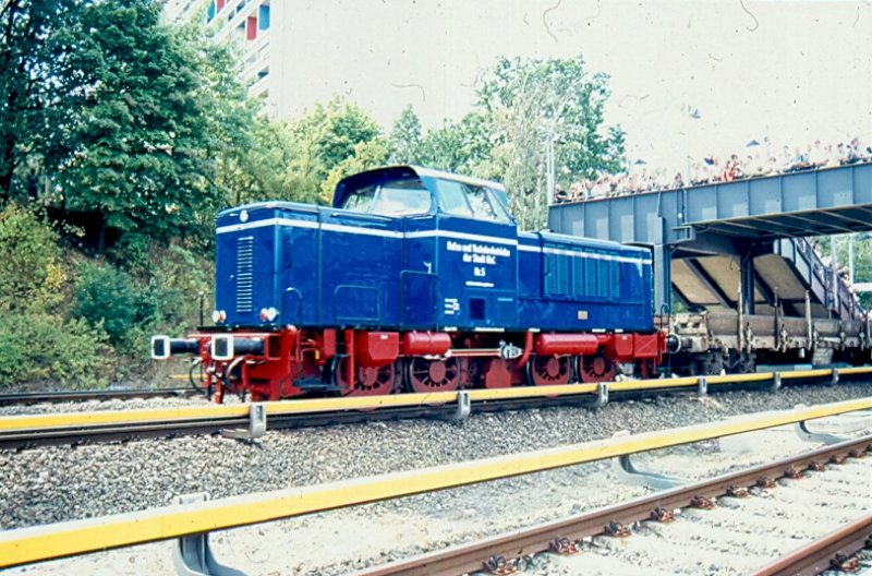 75 Jahre S-Bahn Berlin (August 1999). Als  Gast  verweilte auch eine Hamburger S-Bahn in Berlin. Überführt wurde sie von der V65 der Häfen Kiel. Meines Wissens die einzige noch im Betriebsdienst aktive V65. Hinweis: eingescanntes Dia