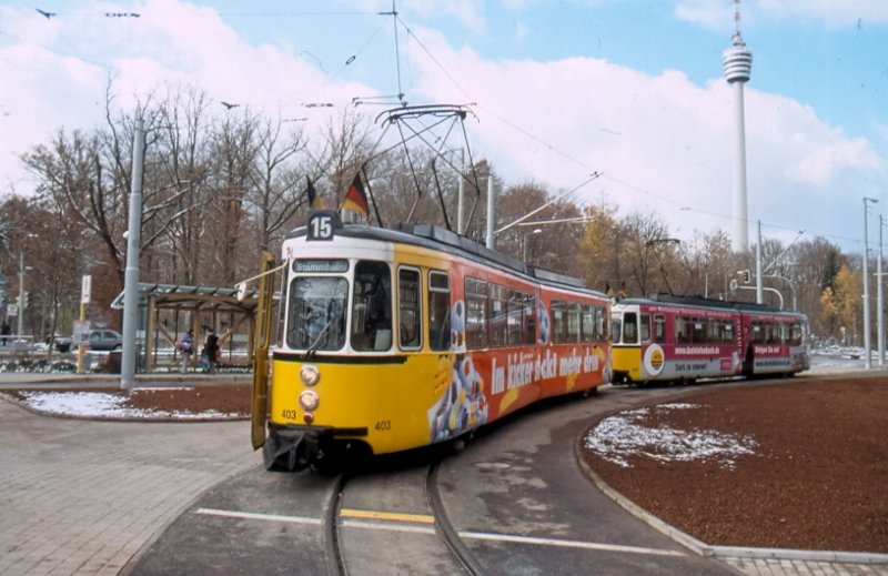 GT4 439 am 16.11.2007. Nun haben die Stuttgarter es tatsächlich geschafft, mit einem enormen finanziellen Aufwand ihr gesamtes Strassenbahn-Netz umzuspuren. Allerdings stellt sich immer noch die Frage wozu???
