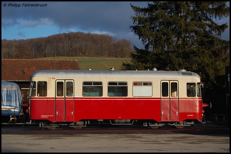 Der frisch gewaschene T 33 der HMB (Härtsfeld Museumsbahn) erstrahlte am 08.12.07 im vollen Glanz bei Sonnenschein vor dem Neresheimer Lokschuppen.