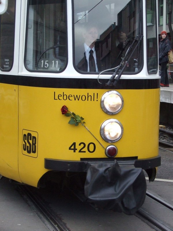 GT-4 443 mit einer Abschiedsrose und "Tot Ziens!" fährt seine letzten Einsatzkilometer im Planbetrieb der SSB auf der Linie 15, die wenig später auf die U15 umgestellt wird. (08.12.2007)