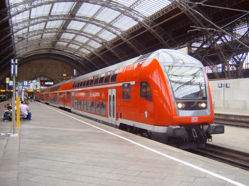 Ziemlich neu und abfahrbereit steht eine Doppelstock S-Bahngarnitur im Leipziger Hauptbahnhof am 26.08.2006