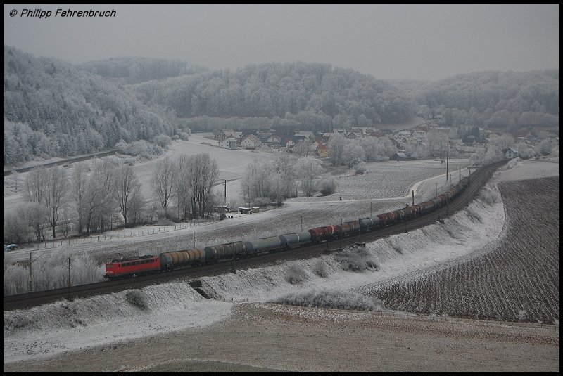 110 425-6 schiebt am 27.12.07 eine für die Filsbahn typische RegionalBahn-Garnitur nach Ulm Hbf, aufgenommen bei Halzhausen.