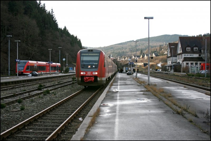 612 042/542 und 612 549/049 sind soeben als RE17 (RE 3907) "Sauerland-Express", von Hagen nach Kassel-Wilhelmshöhe, in Brilon Wald eingefahren und warten nun auf die Abfahrt. Links im Bild wartet die RB55 (RB 23727) "Uplandbahn nach Korbach. (28.12.07)