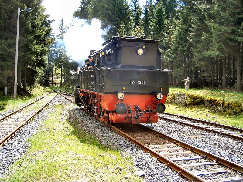 94 1292 im Bahnhof Rennsteig kurz vor dem Gleisende. Rechts, wo der Fotograf steht ,führte früher das Gleis nach Frauenwald, Aufnahme vom Sommer 2005