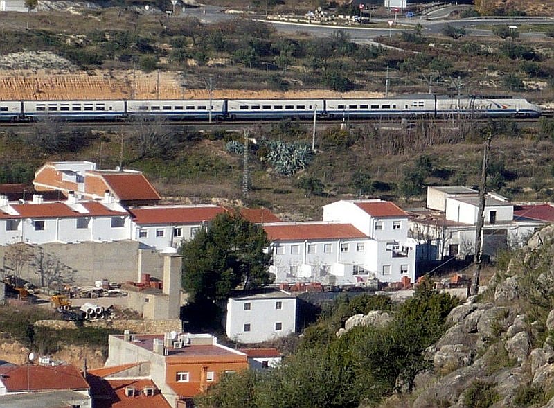 Euromed Madrid - Valencia passiert auf der Schnellfahrstrecke am 03.12.2007 den Ort Moixent.