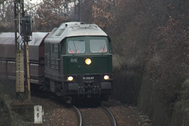 Seit Anfang dieser Woche ist die AVG W232.07 wieder zu Gast auf der Rübelandbahn. Hier zieht sie einen talwärts fahrenden Güterzug von Michaelstein nach Blankenburg-Westend; 30.12.2007