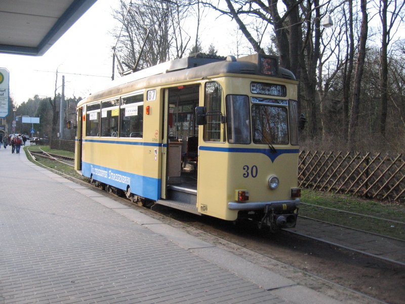 Strassenbahntriebwagen 30 der Woltersdorfer Stzrassenbahn an der Haltestelle Rahnsdorf, Sommer 2007