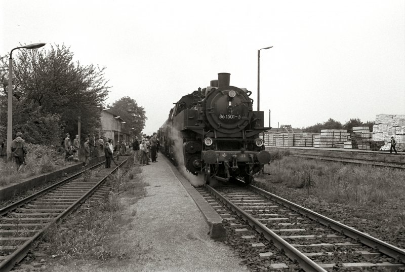 Sonderzug aus langen Halberstädtern und 2*BR86 in Lohmen vor der Abfahrt nach Pirna, 1988