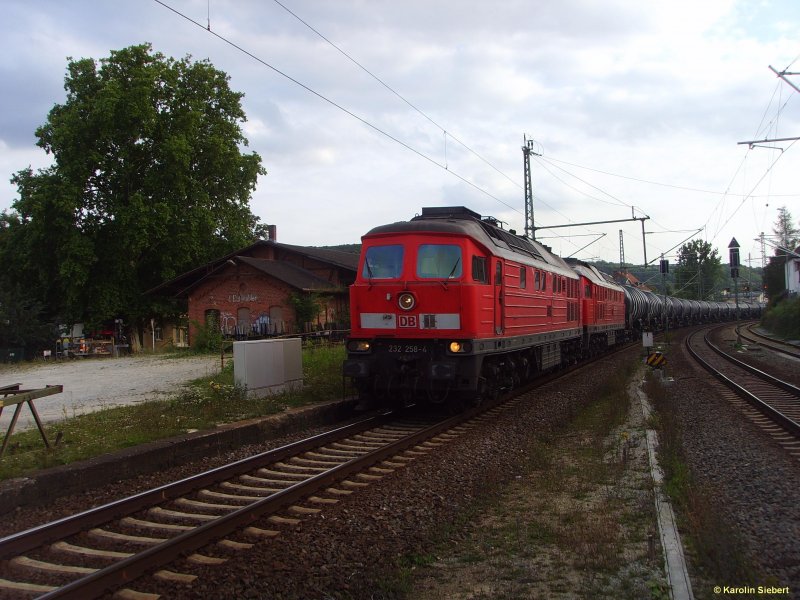 Ein Güterzug mit zwei Loks der BR 232 und Kesselwagen bei einer Durchfahrt in Bad Kösen am 29.08.2007