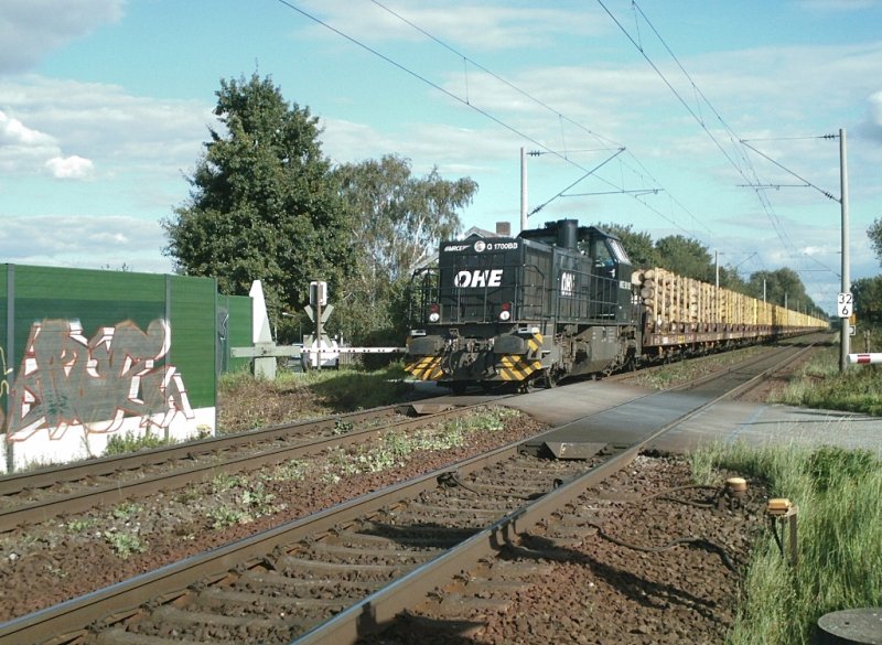 203 003 im Nachschub eines schweren Holzzuges am 19.11.2007 in Göttinge. Vorne schob eine (ex DR 171) von Die Lei