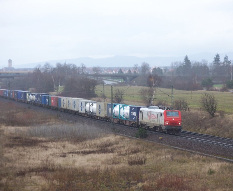 189 045 ohne EVU und ohne Logo mit Containerzug bei Cossebaude in Richtung Dresden; 08.12.2007
