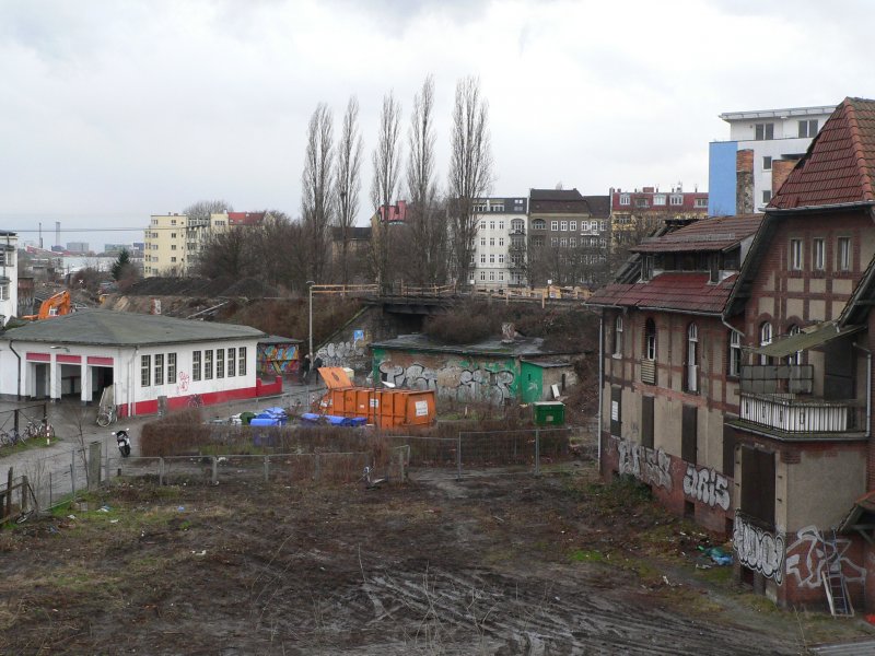 Blick von der Brücke, die die Gleise überquert. Die Scheiben sind zerkratzt, das ist "normal" in Berlin. Oben links der früher benutzte Bahnsteig für die S-Bahn vom Flughafen Schönefeld. Eine Besonderheit war hier, dass diese Linie nur in Richtung Warschauer Straße in Ostkreuz hielt. Die Richtung Schönefeld fahrende S-Bahn hielt nicht. 21.1.2007