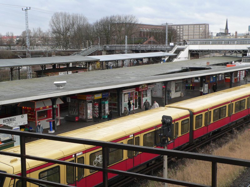 Blick auf Ostkreuz vom Ringbahnsteig aus. Unten eine S-Bahn Richtung Warschauer Straße. Im Hintergrund die Brücke zum Überqueren der Gleise. 21.1.2007