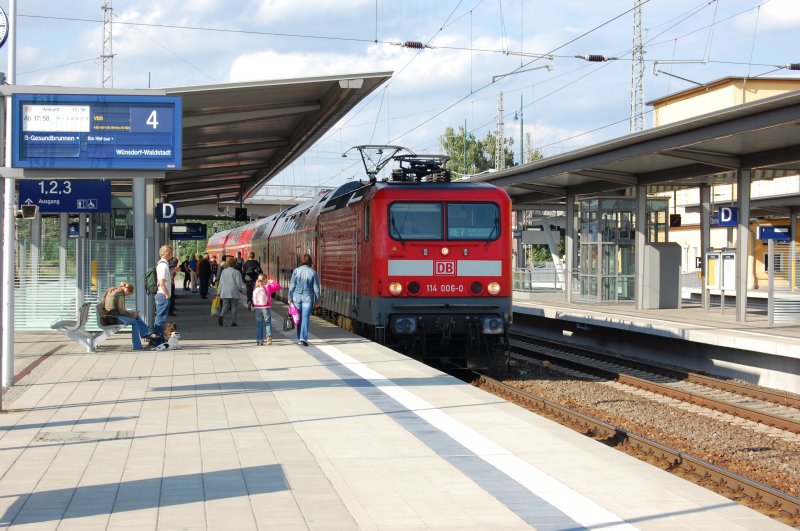 114 006-0 am 30.06.2007 fährt mit RE von Schwedt/O. nach Wünsdorf in Eberswalde ein.