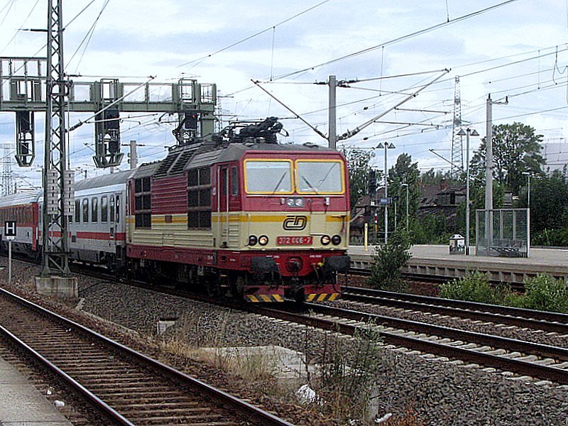 101 070 am EC171 Berlin Gesundbrunnen - Bratislawa beim Durchfahren des Bf Doberlug-Kirchhain am trüben Morgen des 01.07.07.