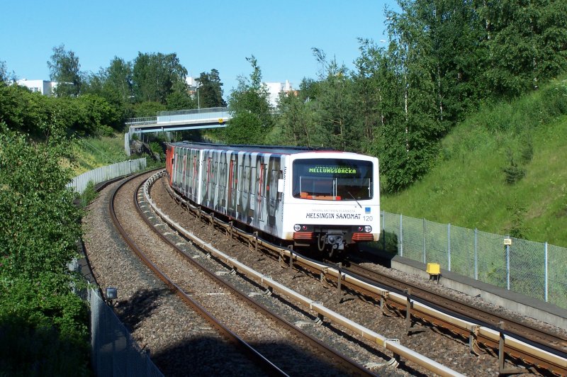 Bei der Metro sah ich nur einen Doppeltriebwagen mit Ganzflächenwerbung. Dies war Tw 120, der am 23.06.2007 bei Gårdsbacka abgelichtet. In Gårdsbacka wird bis Anfang August die Brücke saniert, auf welcher ein riesiges Einkaufszentrum errichtet wurde. Züge aus der Gegenrichtung dieses Zuges schleichen bis zu dieser Station um kurz vor selbiger das Gleis zu wechseln. Reisende vom Zentrum nach Mellungsbacka müssen in Östra centrum umsteigen. Und es besteht nur ein 8-Minuten-Takt. An diesem Zug wirb die große finnische Tageszeitung  Helsingin Sanomat .