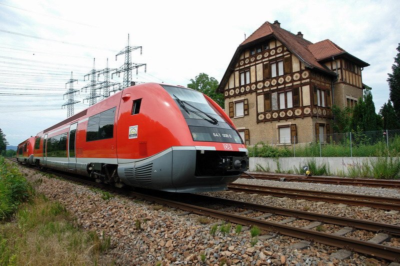 BR 641 008-8. Wenn man mit dem Rad unterwegs ist, sollte man immer eine Kamera dabei haben. Die geschlossene Schranke hinter mir, zeigte einen baldigen Zug an und schon kam der Regionalzug nach Lauchringen angesaust. Bei Rhina (Landkreis Waldshut) am 1.7.2007.