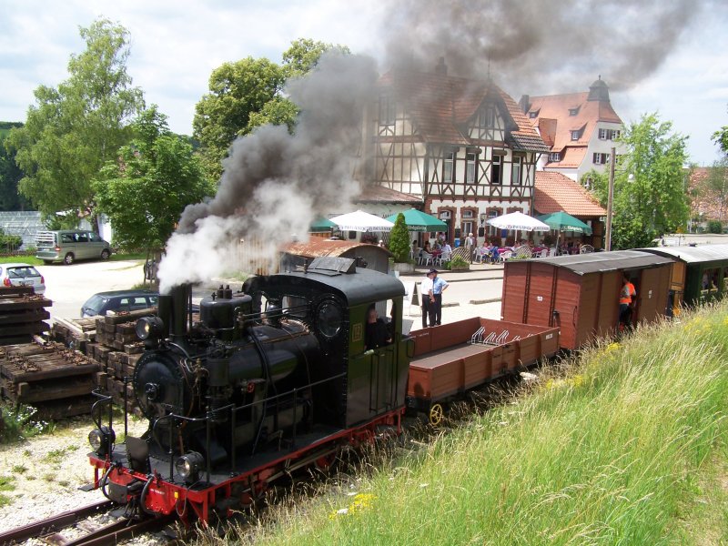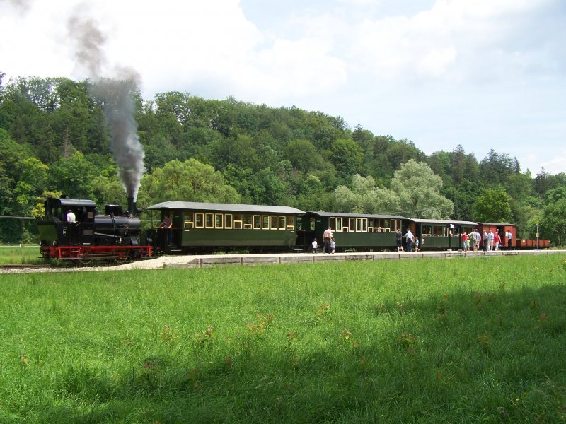 Dampflok Lok.12 der Härtsfeldbahn im Haltepunkt Sägmühle. der Zug fuhr anschließend nach Neresheim über Steinmühle Hp. Aufgenommen am 1.Juni 2007