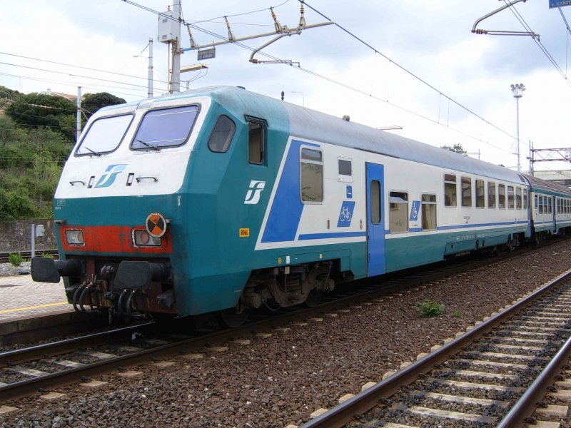Ein Wendezugwagen steht bei einem kurzen Halt in San Vincenzo (Juni 2007)
