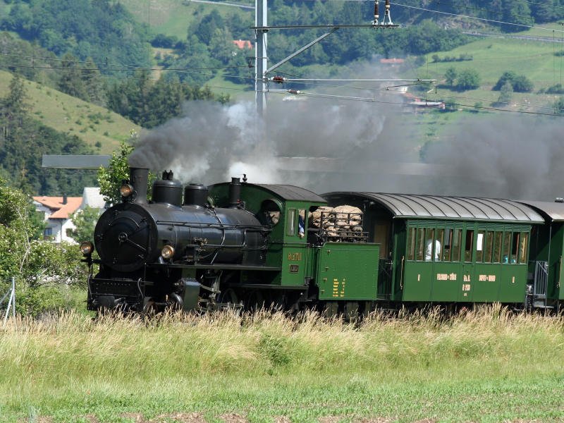 Erster Dampfpendelzug zwischen Bonaduz und Thusis anläßlich des Bahnhofsfestes in Bonaduz am 10.6.2007 kurz vor Rhäzüns. Die Dampflok  Rhätia  blieb solange in Bahnhof Bonaduz zurück. Hinweis: Teleaufnahme.