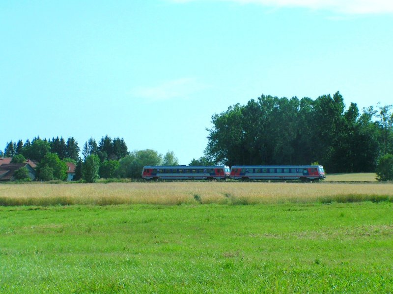 BR 641 005-4. Nur wenige Minuten nach dem Regionalzug nach Lauchringen gingen die Schranken wieder runter und der Gegenzug nach Basel kam angerauscht. Bei Rhina (Landkreis Waldshut) am 1.7.2007.