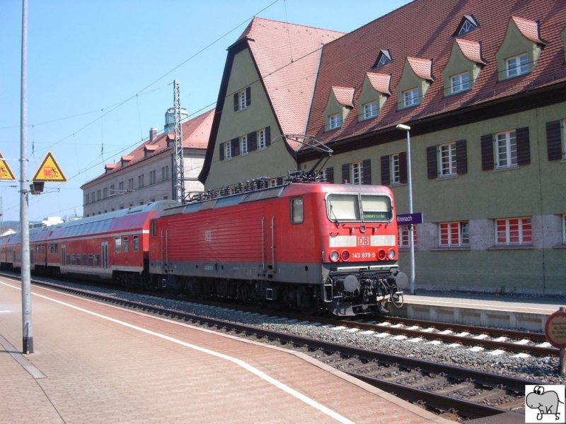 Regionalexpress mit Lok 143 879-5 im Kronacher Bahnhof. Die Aufnahme entstand am 05. Mai 2006.