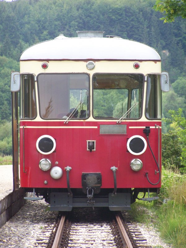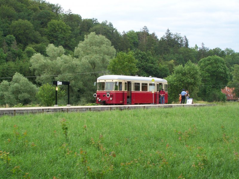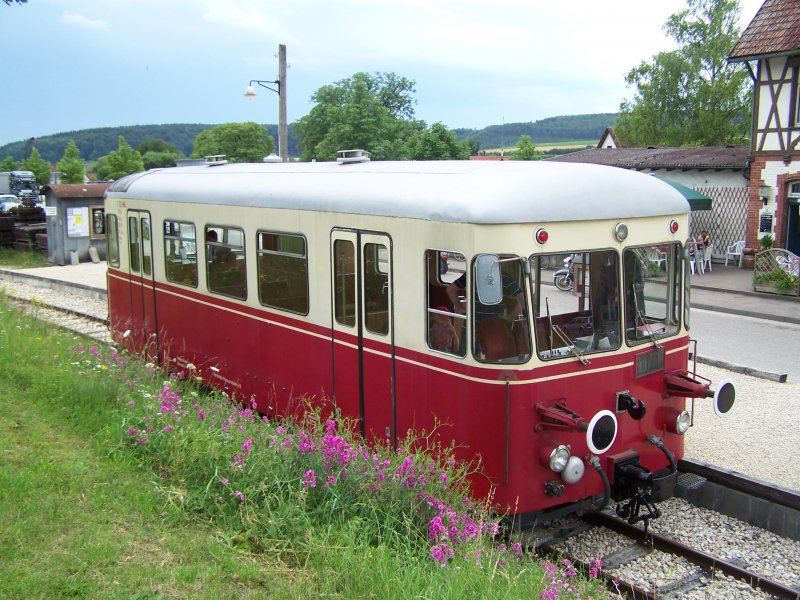 Triebwagen T33 der Härtsfled-Museums-Bahn HMB fuhr am 1.Juli 2007 zum Regelfahrtag von Neresheim nach Sägmühle. Hier im Bahnhof Sägmühle Hp, der Zug fuhr von Sägmühle Hp zurück nach Neresheim über Steinmühle Hp.
