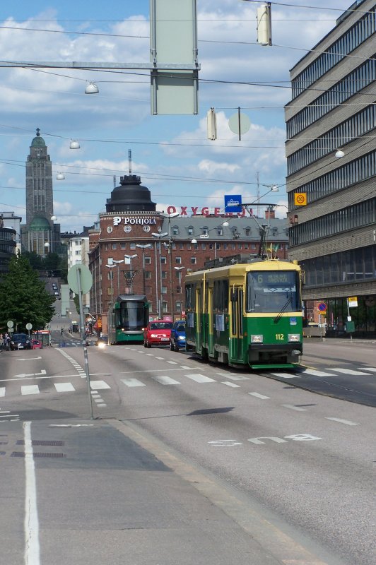 Triebwagen 112 der HST-Reihe Nr II Broholmsgata in Hagnäs am 24.06.2007. Im Hintergrund fährt der Tw 227 aus der Variobahn-Familie. Die Kirche im Hintergrund ist Berghäll kyrka.