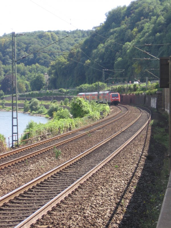 146 001 zieht am 20.07.2007 de RE 5 nach Emmerich. Aufgenommen bei Oberwinter.