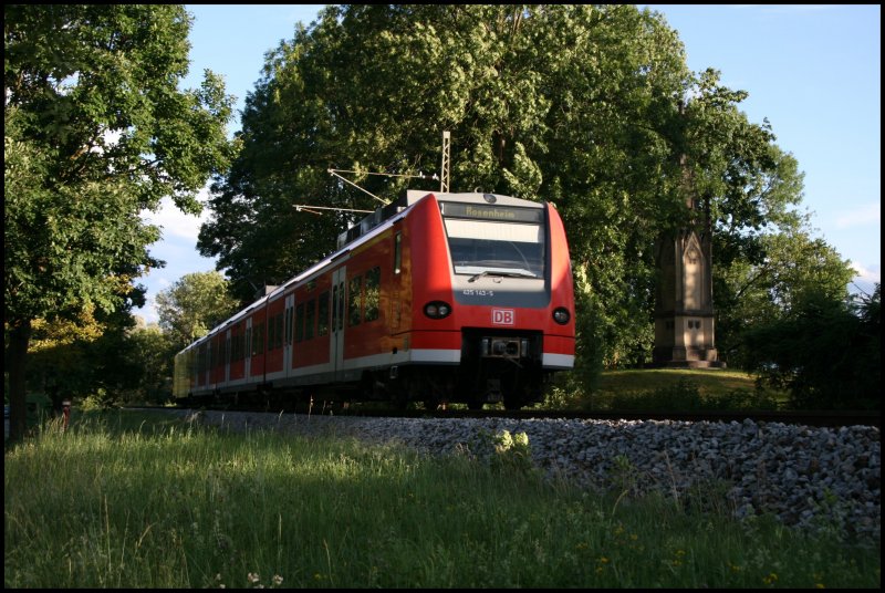 Im letzten Abendlicht des 26.06.07 fährt 425 047 als RB 30260 von Rosenheim nach Kreuzstraße. Aufgenommen beim  Theresienmonument .