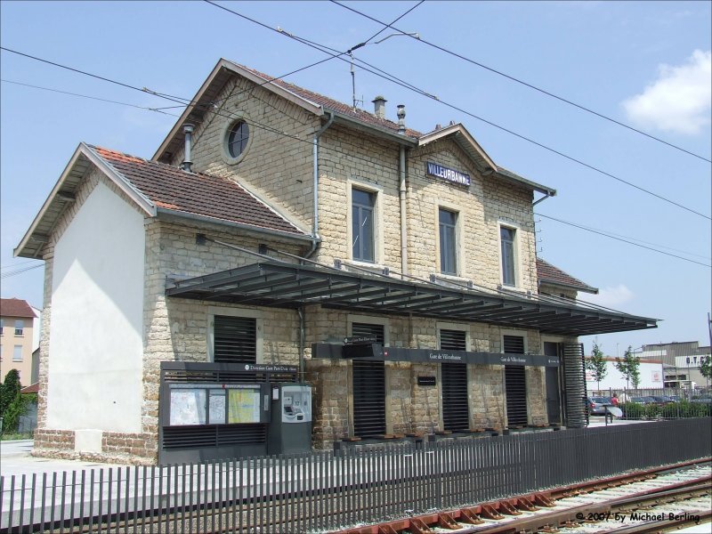 Das alte SNCF Bahnhofgebäude wurd von grund auf renoviert und dient nun der Straßenbahn von Lyon als warte und Info Gebäude am Haltepunkt Villeurbanne. 17.7.2007