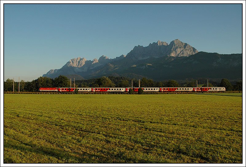 Das erste Foto unserer Fototour vom 16.7.2007 - REX 1503 von Wörgl Hbf. nach Schwarzach-St.Veit aufgenommen mit den ersten Sonnenstrahlen an diesem Tag zwischen Oberndorf in Tirol und St.Johann in Tirol. Und jetzt dürft ihr drei Mal raten, um welchen Berg es sich im Hintergrund handelt *g*