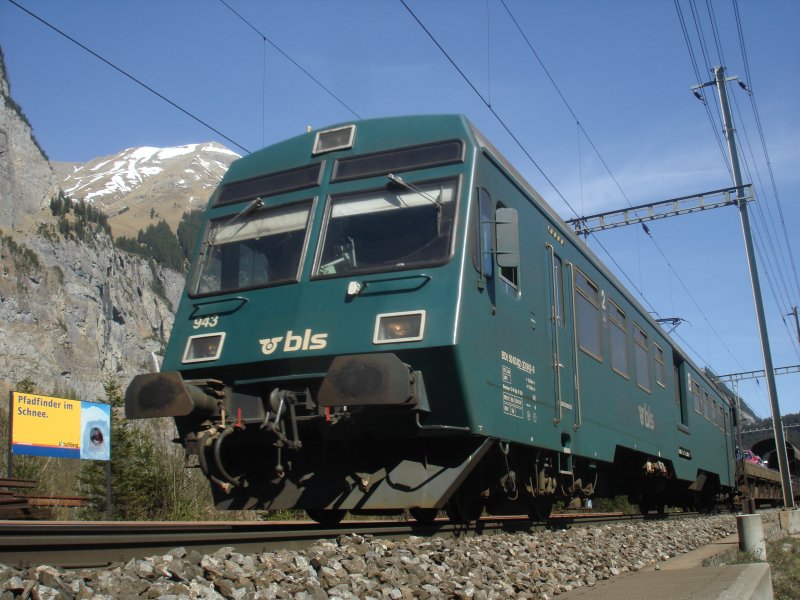 Der BDt 943 strebt mit seinem Autozug dem Lötschbergtunnel entgegen.Bei Kandersteg am 14.4.2007