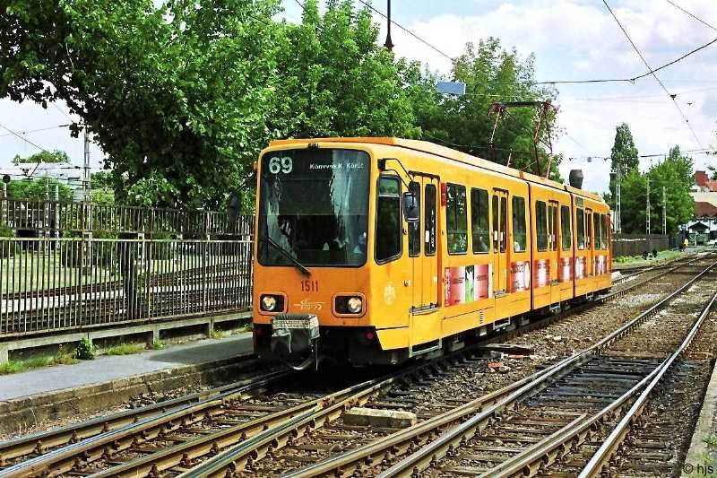 Düwag-Achtachser 1511 kurz vor der Endstelle Mexikói út (5. Juli 2007). 2001/2002 wurden 76 dieser Wagen gebraucht aus Hannover übernommen (Typ TW 6000).
