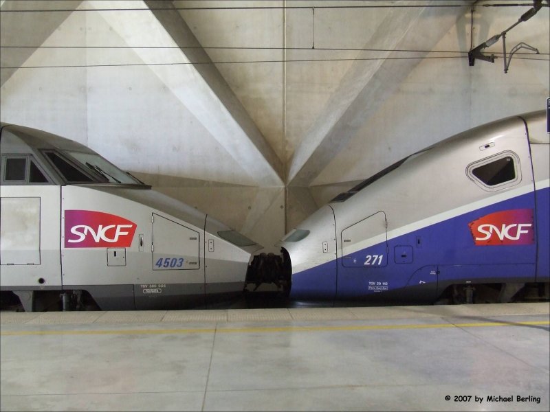 Ein TGV Duplex und ein TGV Réseau beim zwischenhalt am Flughafen Lyon.18.7.07