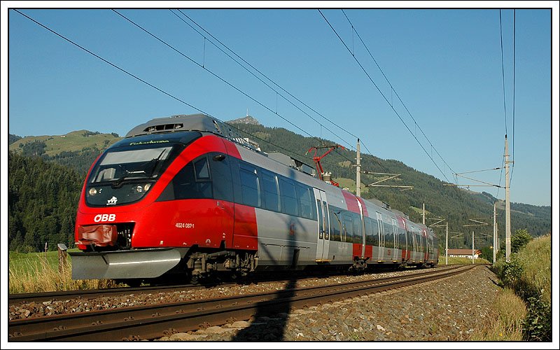 Hier noch einmal 4024 087, diesmal kurz vor Fieberbrunn mit dem R 5253 aus Wörgl am 16.7.2007. In diesem Fall stört der Mastschatten im Triebwagen meiner Meinung nach sehr. Im Hintergrund wieder, das Kitzsteiner Horn.