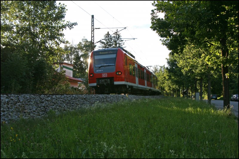 Im letzten Abendlicht des 26.06.07 fährt 425 047 als RB 30260 von Rosenheim nach Kreuzstraße. Aufgenommen beim "Theresienmonument".