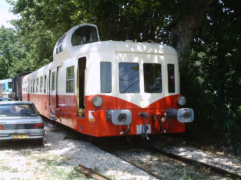 Triebwagen 3979 der Museumsbahn Carnoules - Brignoles. Bemerkenswert an dem Triebwagen ist die Führerstandshaube auf dem Dach, aus der der Fahrer den Triebwagen in beide Richtungn steuert. Außerdem ist der Triebwagen breiter als normale SNCF Fahrzeuge. Er ist der letzte Fahrbereite seiner Art. 30.06.2007