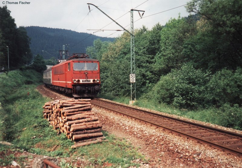 155_243 mit Silberlingen auf der Kbs 840 zwischen Lauenstein und Ludwigsstadt im Juli 1992 unterwegs. ( Die Frankenwaldbahn wurde nach dem Krieg teilweise auf eingleisig zurückgebaut 2-Gl blieb nur das Stück zwischen Pressig und Ludwigsstadt, Nach der Wende wurde zwischen Hochstadt-Markzeuln u. Saalfeld wieder alles auf 2. Gl gebaut.