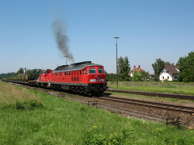 233 643-6 mit einer Abgasfahne in Tüßling am 20.7.07