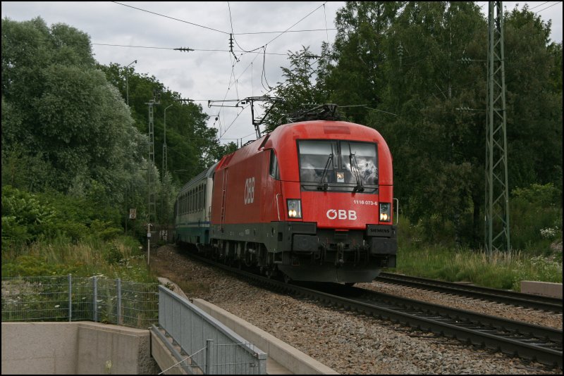 Als die Sonne gerade verschwunden ist, fährt 1116 073 mit dem EuroCity 85 "MICHELANGELO" bei Brannenburg zum Grenzbahnhof Brenner/Brennero. (27.96.07)