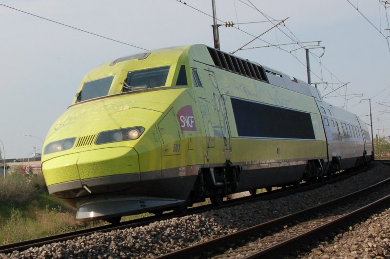 Am 13.04.2007 hat der TGV 503 den Bahnhof Luxemburg soeben mit Fahrtziel Paris-Est verlassen. Der gelbgrüne TGV weist eine interessante Beklebung auf mit skizzierten Streckenabschnitten, die zu symbolisierten Menschen vervollständigt wurden. Ganz schwach unterlegt wird das Gesamtkunstwerk von den Städtenamen, die auf der TGV-Strecke liegen.