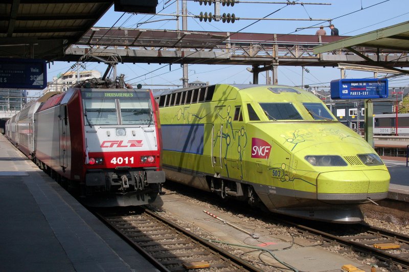 Am 13.04.2007 treffen sich die luxemburgische CFL 4011 der Baureihe 4000 und der TGV 503 im Bahnhof Luxemburg. Der gelbgrüne TGV weist eine interessante Beklebung auf mit skizzierten Streckenabschnitten, die zu symbolisierten Menschen vervollständigt wurden. Ganz schwach unterlegt wird das Gesamtkunstwerk von den Städtenamen, die auf der TGV-Strecke liegen. Das Ziel dieses Zuges wird Paris-Est sein.