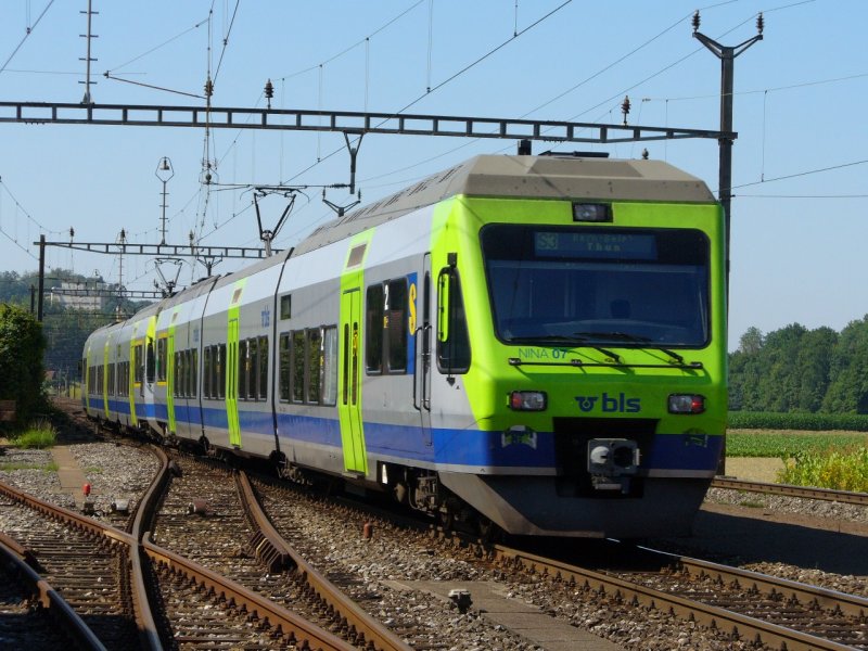 bls - MIx Pendelzug mit bls und SBB Rollmaterial bei der Ausfahrt aus dem Bahnhof von Busswil richtung Büren an der Aare am 15.07.2007