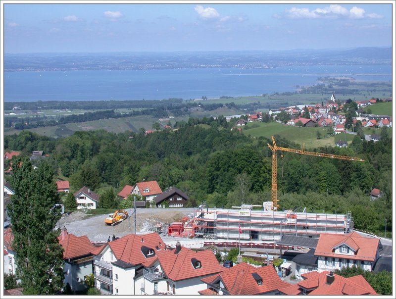 Der Depotneubau fotografiert vom Kirchturm Heiden. Über der Gemeinde Wolfhalden und hinter der Rheinmündung erkennt man Lindau am Bodensee. (18.05.2007)